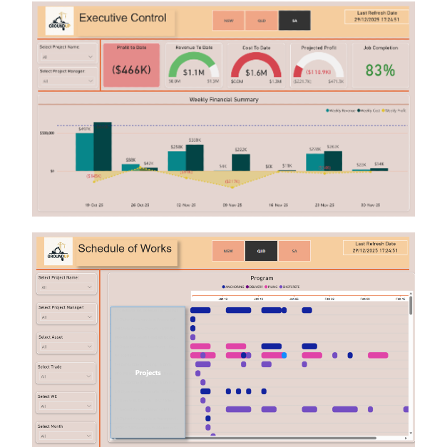 Ground Up Solutions offers Operations and Project Management consulting for Civil and Construction companies, delivering measurable performance through customised KPIs, live dashboards, and weekly reporting across FINANCIAL, SAFETY, and QUALITY outcomes.